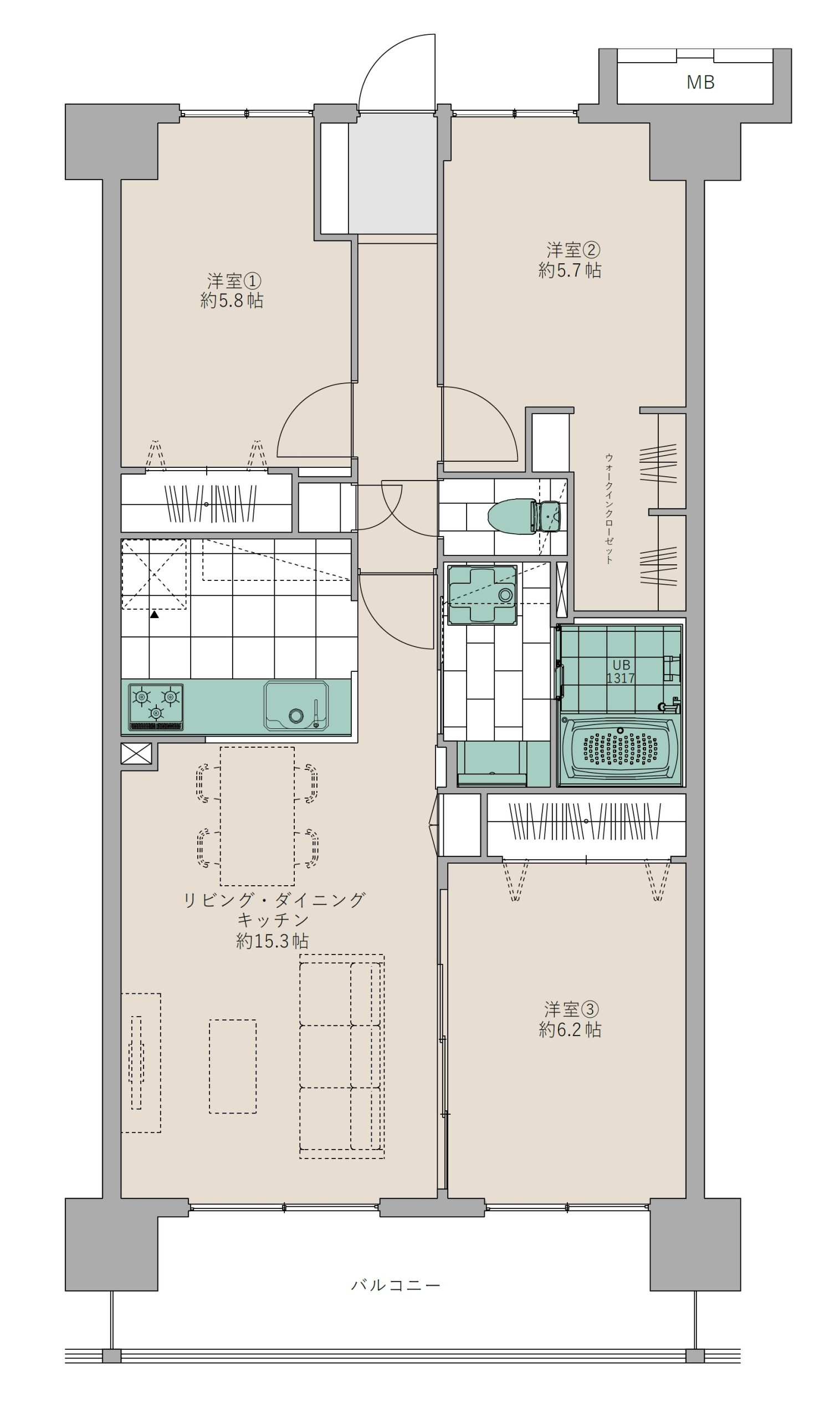 和室から洋室への変更やウォークインクローセットの新設以外には大規模な間取変更はおこなわず、3部屋とLDKを確保しつつより快適に生活するには?を考えてつくられたリノベーション事例です。